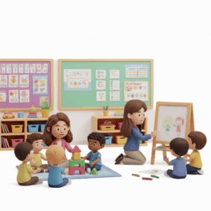 - สภาพแวดล้อมเพื่อการเรียนรู้ (Learning Environment) เช่น การจัดมุมของเล่น สื่อที่หลากหลาย ป้ายสัญลักษณ์ ที่ช่วยให้เด็กพึ่งพาตนเองได้